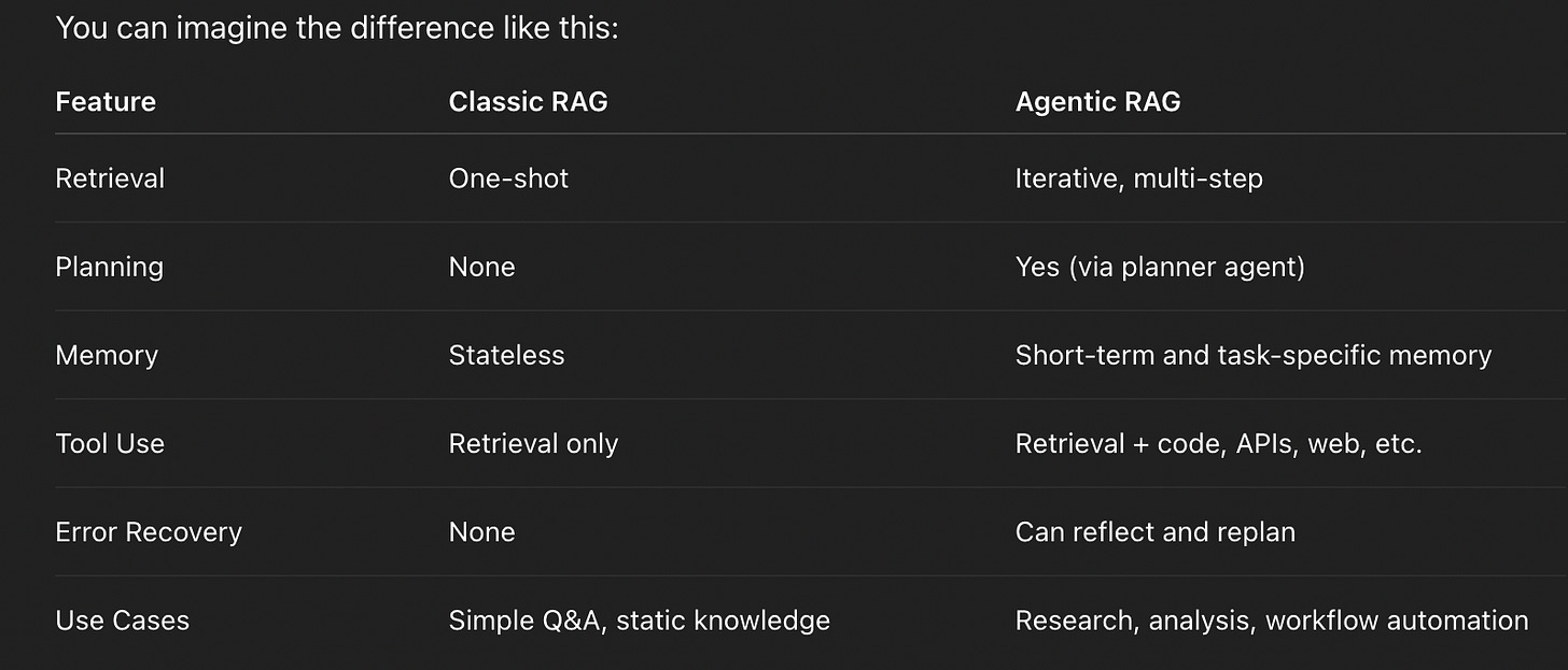 Agentic RAG is especially powerful when the task unfolds in multiple stages like gathering context, checking for contradictions, filling in gaps, and then synthesizing the result. What makes it so compelling is that it behaves more like a teammate than a tool. It doesn't just retrieve it reasons. It doesn’t just repeat it reflects.
