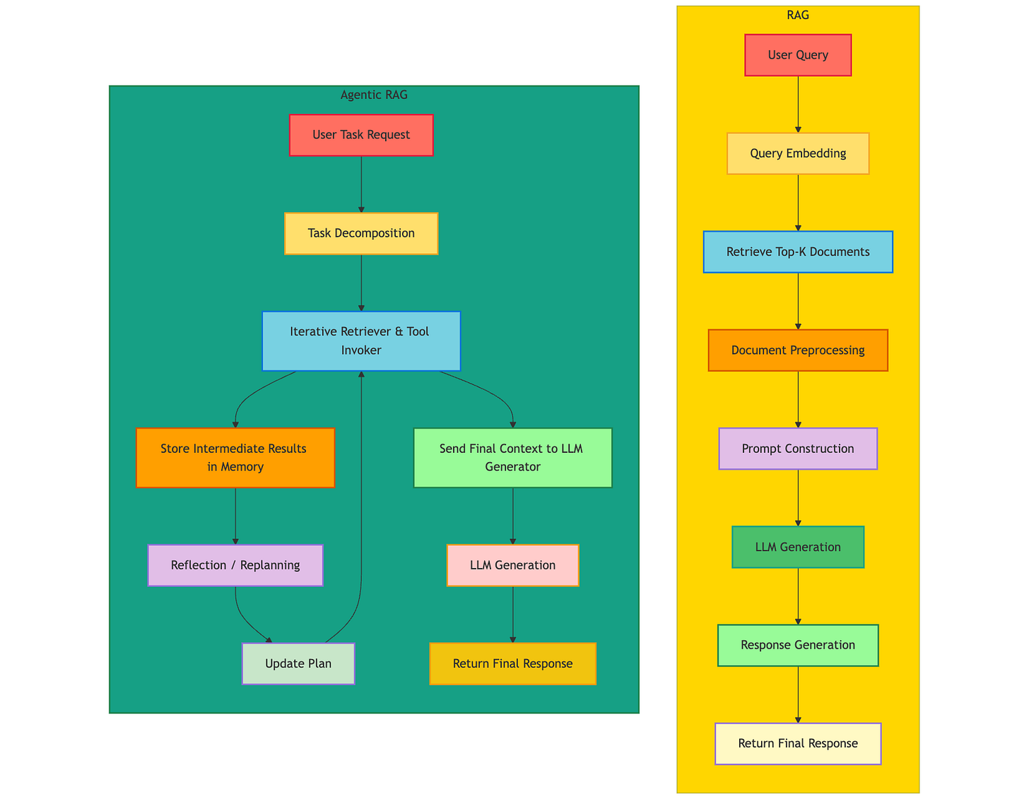 Agentic RAG, on the other hand, is looped, modular, and adaptive. It's more like a research assistant with initiative. It doesn't just retrieve and summarize it plans, tests hypotheses, loops through evidence, calls in help from other tools, and only then composes a thoughtful, structured response. Let’s unpack this through a component-by-component comparison.