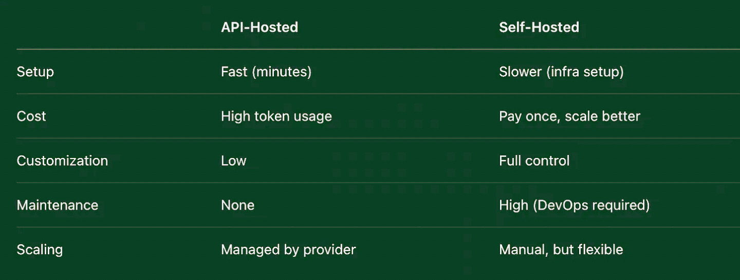 API vs Self-Hosting: Choosing between API hosting and self-hosting isn’t just a technical decision it’s a product decision. Here’s a brief comparison for clarity: